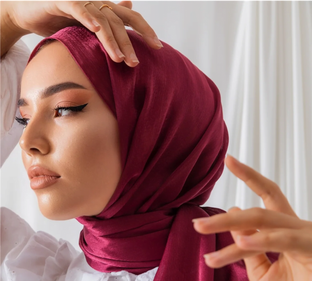 Satin juga menjadi bahan hijab yang jadi primadona di kalangan hijabers karena mampu memberikan kesan mewah dan anggun bagi pemakainya. Permukaan kain satin memiliki tekstur yang glossy dan halus, sehingga cocok untuk digunakan dalam momen yang formal. Tingkat gramasi pada kain satin pun cenderung kecil, namun kerapatan antar benangnya sangat tinggi.